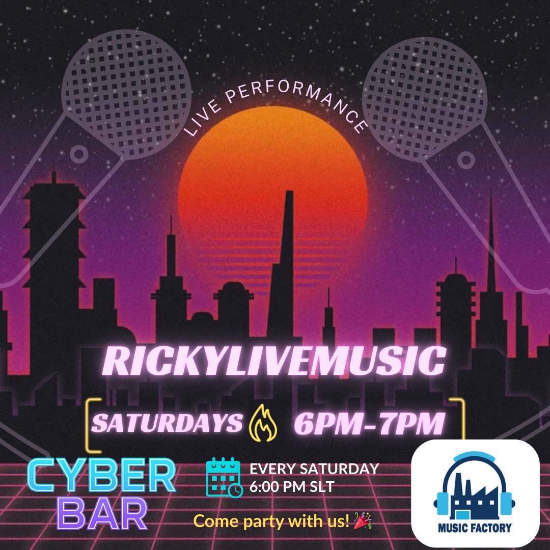 π€π₯ RickyLiveMusic LIVE at Cyber Bar π₯π€ β¨ Every Saturday | 6:00β7:00 PM SLT β¨ Winner of SL Got Talent 2013, RickyLiveMusic is a powerhouse vocalist, producer, and multi-instrumentalist who brings every style of music to life! From opera to country, jazz to rock, reggae to hip hop, Latin to blues, he covers it all β in five languages β with the versatility to fit any crowd and any vibe. πΉ Professional background: Award-winning live singer & recording artist Pianist & guitar player Producer & songwriter with years of real-world and SL stage experience πΆ Expect an unforgettable Saturday night of live music, blending emotional ballads, upbeat hits, and genre-spanning favorites that showcase Rickyβs incredible vocal range and charisma. π Cyber Bar β The Gridβs Neon Hotspot π SURL: https://maps.secondlife.com/secondlife/VMS/212/44/3000 β¨ Presented by VMS & Music Factory Come dance, relax, and experience the true voice of Second Life β RickyLiveMusic, every Saturday at Cyber Bar!