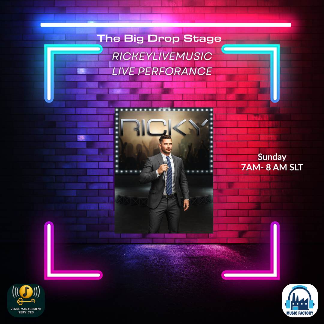 RickyLiveMusic LIVE at The Big Drop Stage Winner of SL Got Talent 2013, RickyLiveMusic is a powerhouse vocalist and multi-instrumentalist bringing you an unforgettable 2-hour performance packed with emotion, energy, and versatility. From opera to country, jazz to rock, reggae to hip hop, Latin to blues β Ricky covers it all, in five languages, with the charisma and passion that keeps crowds coming back for more. Saturday, October 4th 12:00β2:00 PM SLT The Big Drop Stage SURL: https://maps.secondlife.com/secondlife/VMS/138/188/22 Presented by VMS & Music Factory Two full hours. One incredible voice. A show you donβt want to miss. #BigDropStage #RickyLiveMusic #VMS #MusicFactory #LiveSinger #SecondLifeEvents