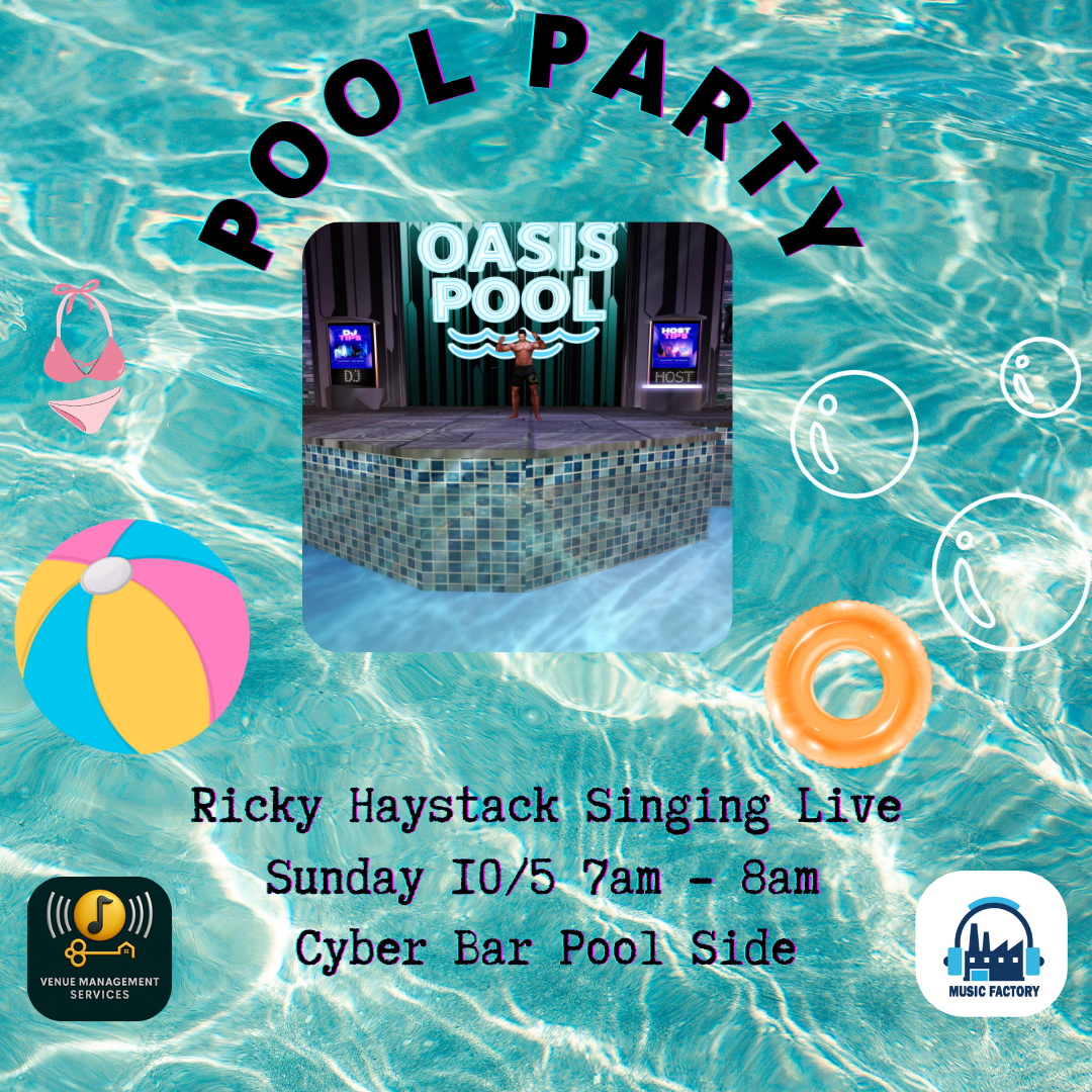 ποΈπΆ Ricky Haystack LIVE β Pool Party at Cyber Bar Oasis! πΆποΈ Splash into the weekend with Ricky Haystack β bringing soulful vocals, timeless hits, and pure live energy to the Cyber Bar Pool Oasis! ππ€ π Saturday, October 5th β° 7:00β8:00 AM SLT π Cyber Bar β Pool Oasis π SURL: https://maps.secondlife.com/secondlife/VMS/212/44/3000 β¨ Music β’ Sunshine β’ Poolside Vibes Start your morning right with great tunes, friends, and the Cyber Bar glow. #CyberBar #PoolOasis #RickyHaystack #LiveMusic #VMS #MusicFactory #SecondLifeEvents