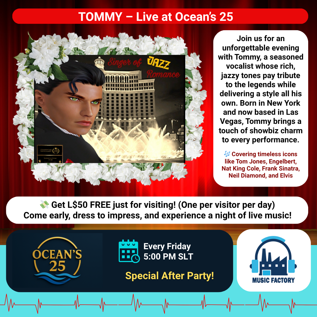 π An Evening with Tommy C β Live at Oceans 25 Ballroom π Every week, the grand Oceans 25 Ballroom opens its doors to an unforgettable hour of live music with the one and only Tommy C (xxtommyc56 Resident). Known across the grid for his rich, dynamic voice and versatile style, Tommy takes the stage with a performance that blends heartfelt emotion with irresistible energy. From smooth ballads that melt the heart to upbeat classics that have everyone tapping their feet, Tommyβs setlist is carefully crafted to create a journey through music. His connection with the crowd is genuine β he chats, jokes, and makes sure everyone feels part of the show. Step inside our gold-and-red ballroom, where chandeliers cast a warm glow over the dance floor, and let yourself be transported by the atmosphere. Whether youβre in the mood to dance, relax with friends, or just lose yourself in the music, this is your Thursday night escape. π When: Every Week β° Time: 5:00 PM β 6:00 PM SLT π Venue: Oceans 25 Ballroom π SURL: https://maps.secondlife.com/secondlife/VMS/128/128/25 β¨ Join us for a night where music meets magic β every week with Tommy C! β¨ #Oceans25 #TommyC #LiveSinger #BallroomEvents #VMS #SecondLifeMusic #LiveMusicInSL