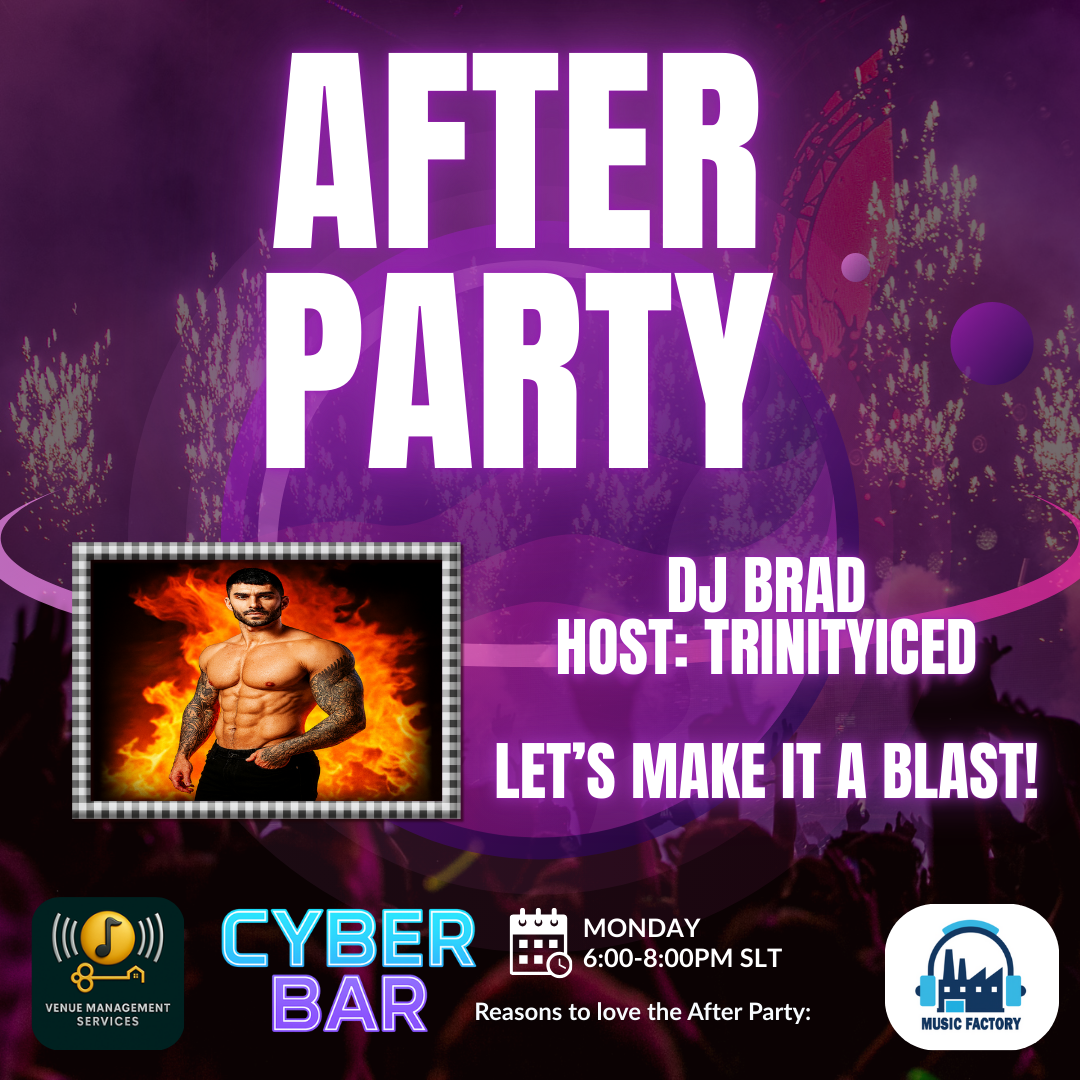 π₯πΆ TUESDAY NIGHT AFTER PARTY β CYBER BAR πΆπ₯ The music doesnβt stop when the live performance ends β it only gets hotter! Right after Dorian Dragon shakes the walls with his epic live rock set, the dance floor belongs to DJ Brad Nix and Hostess Trinity for an AFTER PARTY that will keep you moving all night. π§ DJ Brad Nix β A master of the mix, blending high-energy tracks, club anthems, and crowd favorites to keep the post-show buzz alive. Expect beats that make it impossible to stand still. π Hostess Trinity (TrinityIced Resident) β The queen of connection, lighting up the room with her fun personality, keeping the conversation flowing, and making sure every guest feels part of the party. ποΈ Every Tuesday β right after Dorian Dragon Live π 7:00 PM β 8:00 PM SLT π Cyber Bar β The Gridβs Ultimate Nightlife Destination π SURL: https://maps.secondlife.com/secondlife/VMS/212/44/3000 β¨ Presented by VMS & Music Factory When Dorian Dragonβs guitars fade, the bass drops and the lights pulse β and you know the after party has begun. This is your chance to: β Keep the adrenaline high from the live show β Dance, mingle, and connect with other music lovers β Enjoy a fresh mix of tracks that take you from rock energy to dancefloor euphoria β Close out your Tuesday night with a bang π€ The formula is simple: Live music β‘ Electric beats β‘ Legendary night π Donβt log out after the main event β teleport over and keep the celebration alive with DJ Brad & Trinity at Cyber Bar. π¨ VMS β Venue Management Services π¦ Music Factory β Second Lifeβs Live Music Powerhouse #VMS #MusicFactory #CyberBar #DJBrad #HostTrinity #AfterParty #DorianDragon #SecondLifeEvents #SLNightlife #SLMusicScene #LiveDJ
