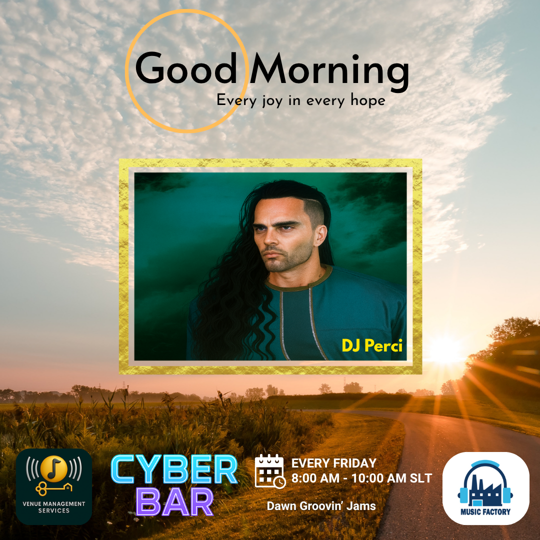 πΆπ₯ Friday Morning Heat at Cyber Bar! π₯πΆ Wake up and move your feet β DJ Perci (Percival Beaumont) is bringing his high-energy style to Cyber Bar for a 2-hour music journey you wonβt want to miss! Known for his seamless mixing, killer track selection, and ability to read the crowd, Perci will keep you dancing from the first beat to the last drop. π§ Expect a perfect blend of fresh remixes, timeless hits, and unexpected gems β all designed to get your heart pumping and the dance floor alive. Whether youβre here to dance non-stop or just soak in the vibes, this set will kick your Friday into high gear. β° Time: 8:00 AM β 10:00 AM SLT π Venue: Cyber Bar π SURL: https://maps.secondlife.com/secondlife/VMS/212/44/3000 π Bring your friends, grab your favorite dance animations, and let the morning melt away in a rush of sound, light, and movement. Cyber Barβs atmosphere, lights, and sound system are ready to make this an unforgettable start to your weekend. π€ Presented by VMS & Music Factory #VMS #MusicFactory #CyberBar #DJPerci #SecondLifeMusic #SLParty #FridayVibes #LiveDJ