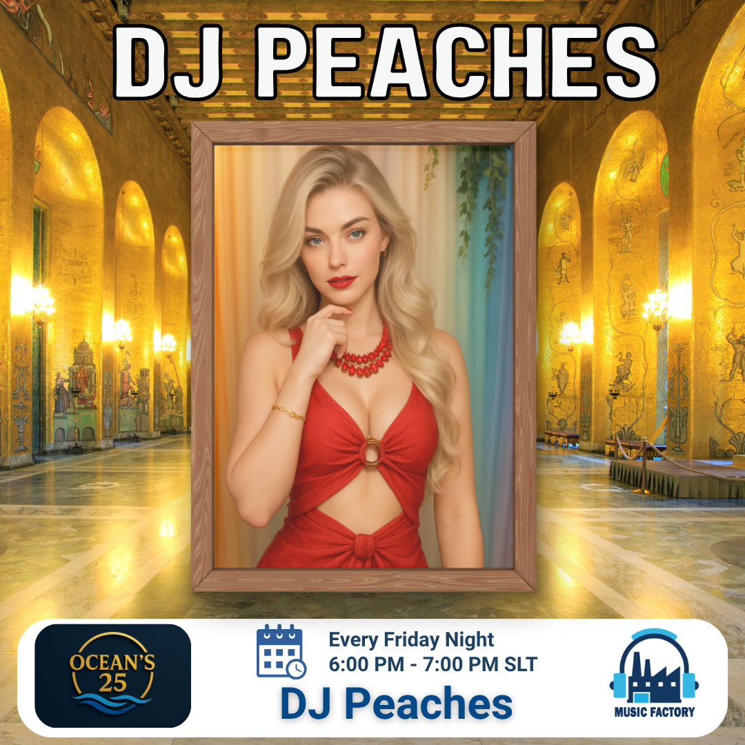 β¨ Friday Evenings at Oceans 25 Ballroom β¨ Step into the golden glow of the Oceans 25 Ballroom every Friday evening for a perfect mix of elegance, rhythm, and warm conversation. This week, DJ Peaches (Atlanta1 Georgia) takes over the decks, filling the ballroom with a hand-picked selection of dance favorites and smooth grooves. Her vibrant personality and sharp DJ skills keep the floor alive, while Host SiriMet Resident welcomes every guest with a smile and ensures the evening feels like a true VIP experience. Whether youβre here for a romantic slow dance, a lively group number, or just to relax and enjoy the atmosphere, this is the place to be to start your weekend right. π When: Every Friday β° Time: 6:00 PM β 7:00 PM SLT π Venue: Oceans 25 Ballroom π SURL: http://maps.secondlife.com/secondlife/Oceans%2025/121/123/25 #Oceans25 #BallroomEvents #DJPeaches #SecondLifeMusic #VMS #BallroomDancing #LiveDJ