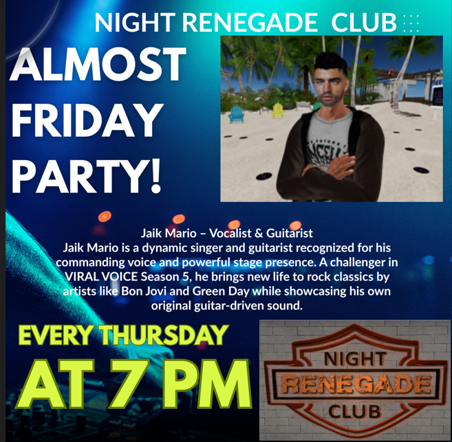 πΈπ€ Jaik Mario LIVE @ Renegade Night Club π€πΈ Jaik Mario is a dynamic vocalist and guitarist whose performances blend powerful rock energy with heartfelt originality. Known for his commanding vocal range and authentic stage presence, he delivers both iconic covers and original compositions that captivate every audience. π Recognized in VIRAL VOICE Season 5 for his standout renditions of rock classics like Bon Jovi and Green Day, Jaik brings his own unique edge to every show β balancing legendary hits with his signature sound. π Every Tuesday β° 6:00β7:00 PM SLT π Renegade Night Club, Spur (134, 128, 21) π SURL: secondlife://Spur/134/128/21 β¨ Presented by VMS & Music Factory One voice. One guitar. One unforgettable hour of live music. #RenegadeNightClub #VMS #MusicFactory #JaikMario #LiveSinger #SecondLifeEvents #SLMusic