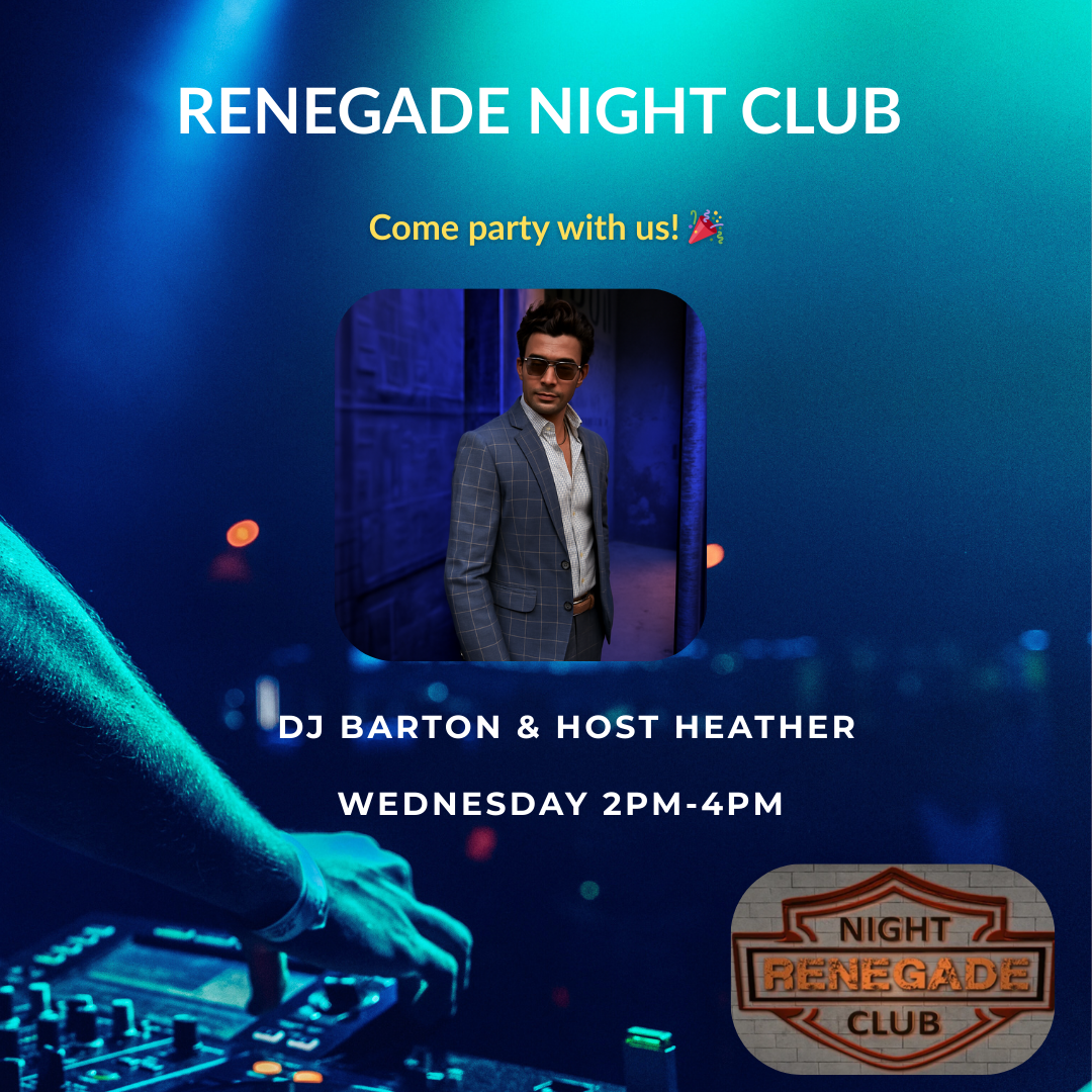 🎶🔥 Barton Kidd LIVE at Renegade Night Club! 🔥🎶 🗓 Wednesday ⏰ 2:00 PM – 4:00 PM SLT 📍 Renegade Night Club, Spur (134, 128, 21) 🌐 SURL: secondlife://Spur/134/128/21 🎸 Barton Kidd brings his signature style and raw musical energy straight to the Renegade stage — rocking your midweek with unforgettable tunes and good vibes. 👉 Come dance, hang out, and keep the music alive at Renegade Night Club!